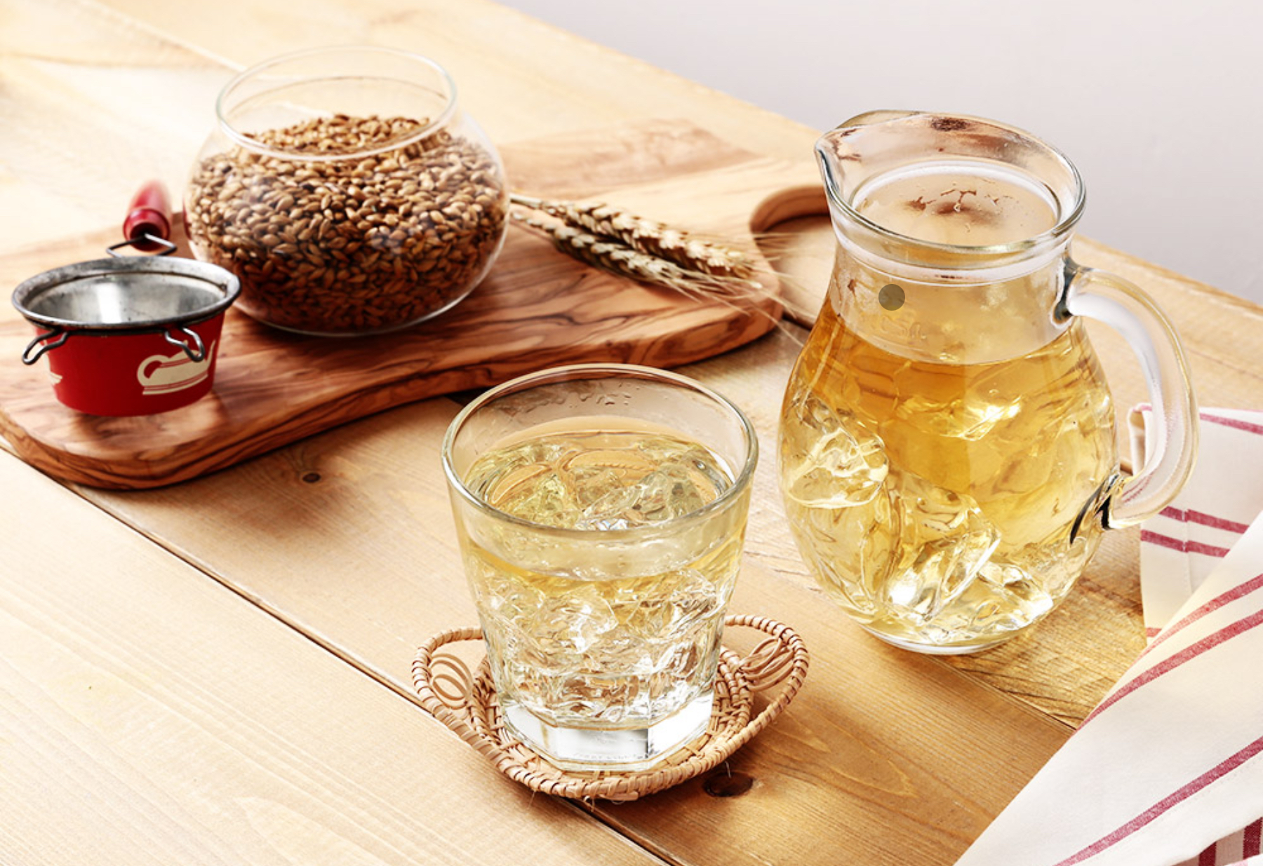Comme vu précédemment, le « thé d’orge » (麦茶, mugicha) ne contient pas de thé. En fait, il ne contient que de l’orge concassé et grillé (ou torréfié). Pas de théine donc ! Cela fait que le breuvage n’est pas excitant, ni irritant pour l’estomac, et peut être consommé à tout moment de la journée.