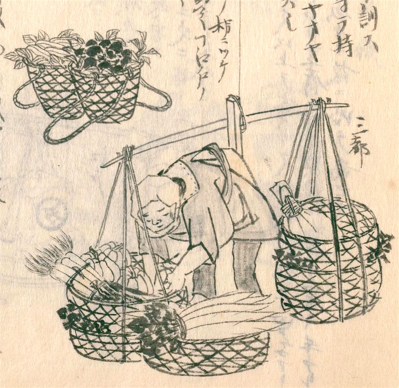 Pour comprendre comment le mugicha est devenu le mugicha, il faut faire un petit tour par l’ère d’Edo (1603-1868) et ses marchand-e-s de rue, aussi appelés Botefuri. Le site Nippon nous offre un article très instructif à ce sujet, illustré par les magnifiques croquis de Kitagawa Morisada. Dessinateur dont les croquis illustrent tous les aspects de la vie quotidienne du Japon à l’ère d’Edo, ses dessins ont en partie été retrouvés… Dans une bouquinerie !