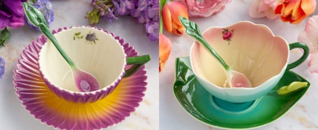 Les tasses fleuries sont idéales pour les sorties entre ami-e-s ! Que la forme rappelle les années 70-60 ou se rapproche des modèles plus anciens, les tasses fleuries sont un moyen certain d’égayer la pause thé !