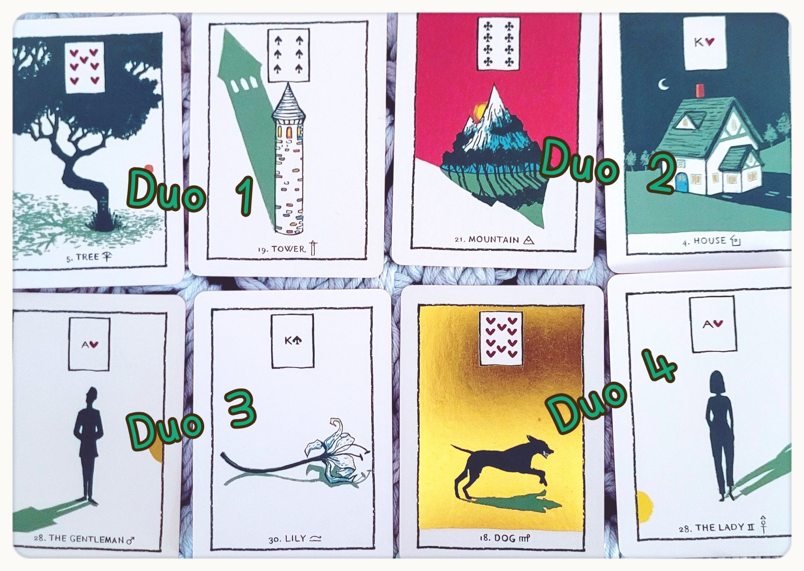 Comme dit plus haut, le petit Lenormand est efficace avec plusieurs cartes. Aussi, j’ai remarqué que bien souvent deux cartes suffisent pour comprendre un message et surtout elles forment beaucoup de duos. Lorsque je tire pour une question générale je vais donc former un carré avec 8 cartes: commencer par deux cartes placées en haut à gauche: cela sera le passé de la relation – passé = les semaines précédentes, voire un mois ou deux mais pas plus.